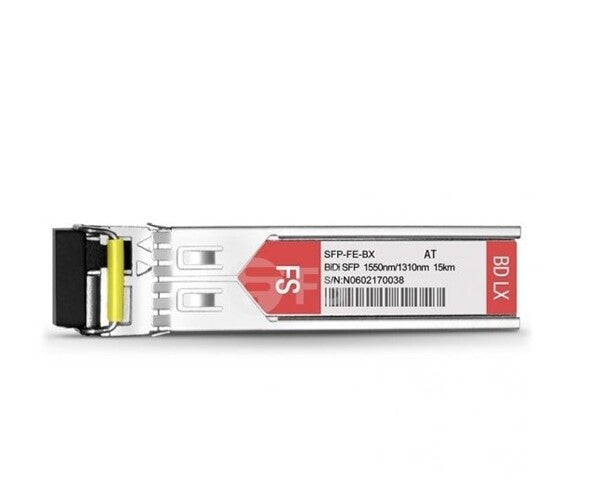 Description: Allied Telesis compatible 100BASE-BX BiDi SFP transceiver module designed for single-mode fibre links. Supports 100 Mbps data rates with bidirectional transmission over a single fibre using different wavelengths for transmit and receive.