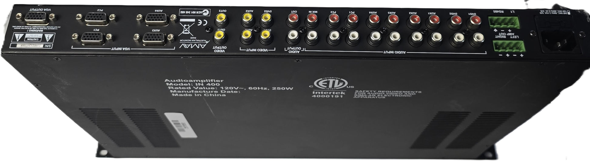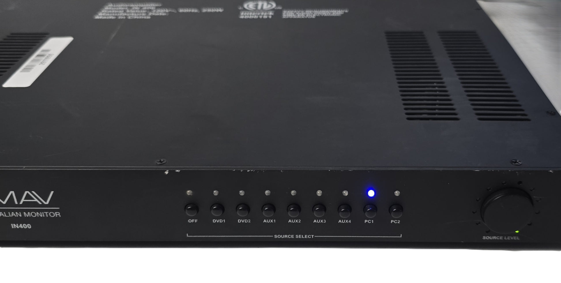 The IN400 supports multiple audio and video input sources with front-panel source selection and level control, allowing easy operation and flexible system configuration. The solid metal enclosure is designed for durability and long-term installation use, while rear-panel connectivity provides clear access to audio, video, and control interfaces. Supplied in original packaging with power cable, remote control, and installation and operation manual as shown.