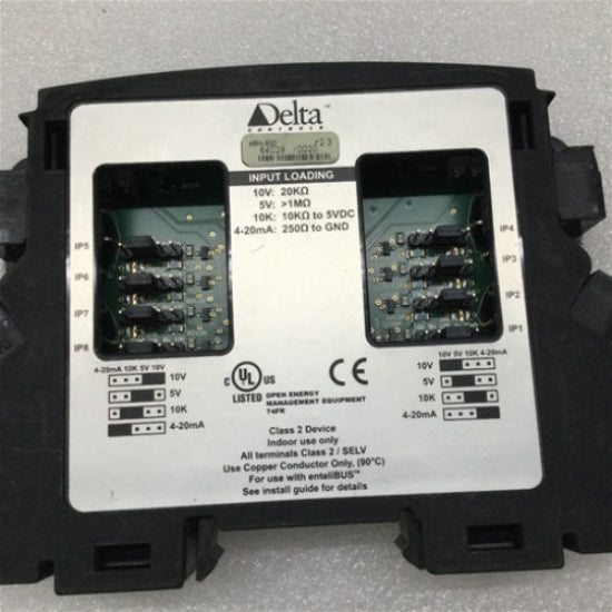 Delta Controls enteliBUS expansion module. Provides 8 universal inputs for BACnet applications. Designed for integration with enteliBUS controllers to extend input capacity in building automation systems.