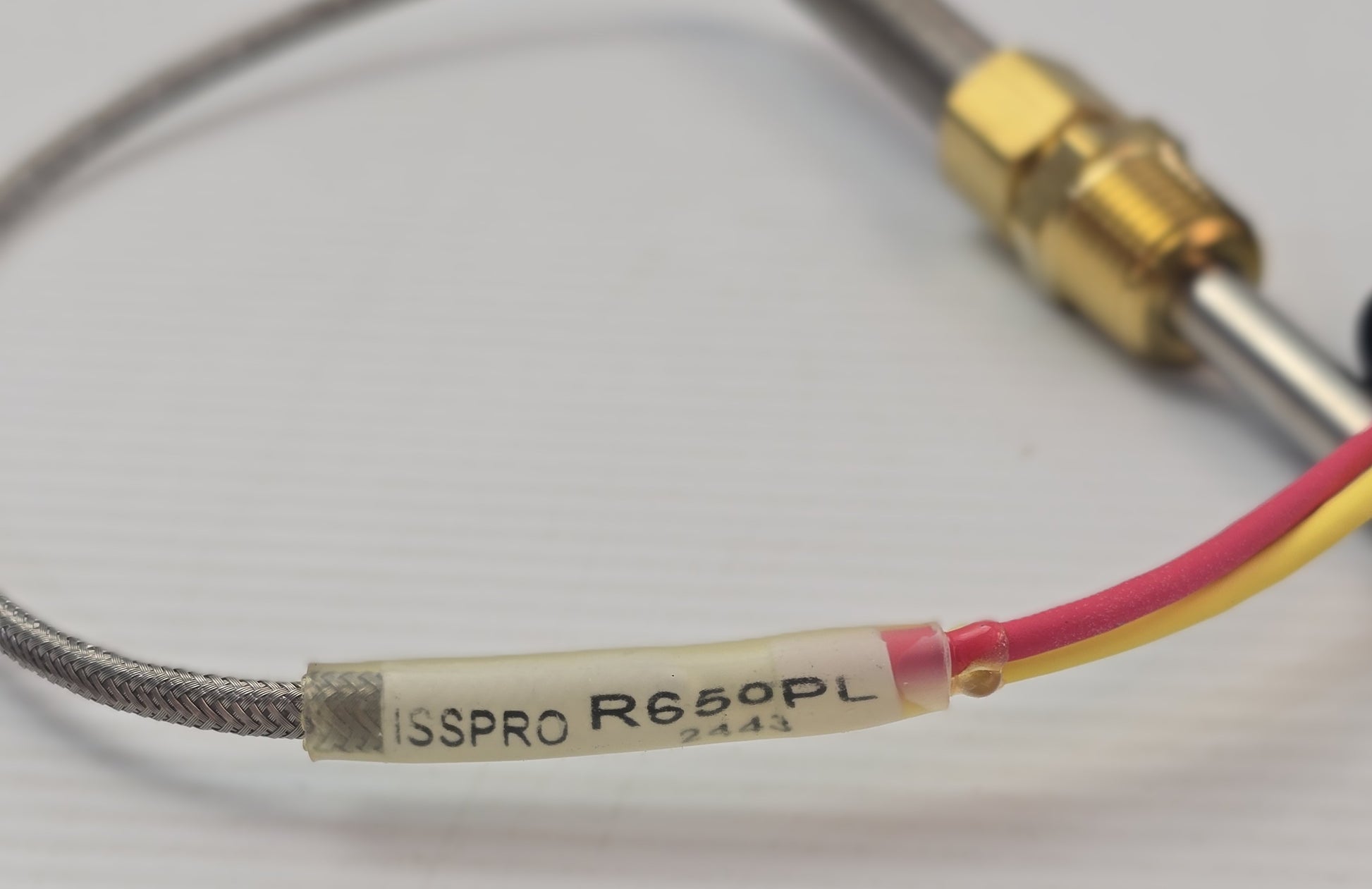 Description: ISSPRO R650PL Type K thermocouple probe with 2.25" stainless steel sensor and plug connector. Designed for precision temperature measurement up to 1800°F in automotive, diesel, and industrial applications. Features durable stainless-steel braided lead, brass compression fitting, and 1/4" NPTF threading for easy installation.