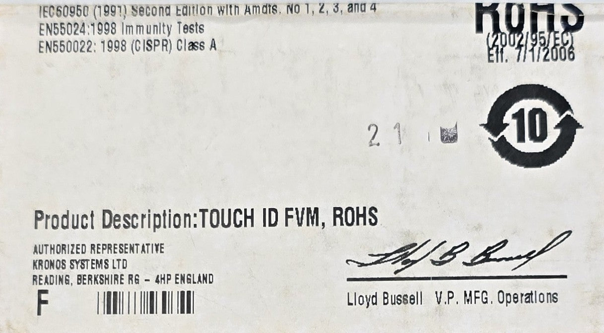 Description: Kronos Touch ID FVM biometric time clock terminal, part number 8602801-001. Designed for workforce time and attendance applications using fingerprint authentication. RoHS compliant and CE marked. Enterprise-grade unit suitable for integration into Kronos workforce management systems.