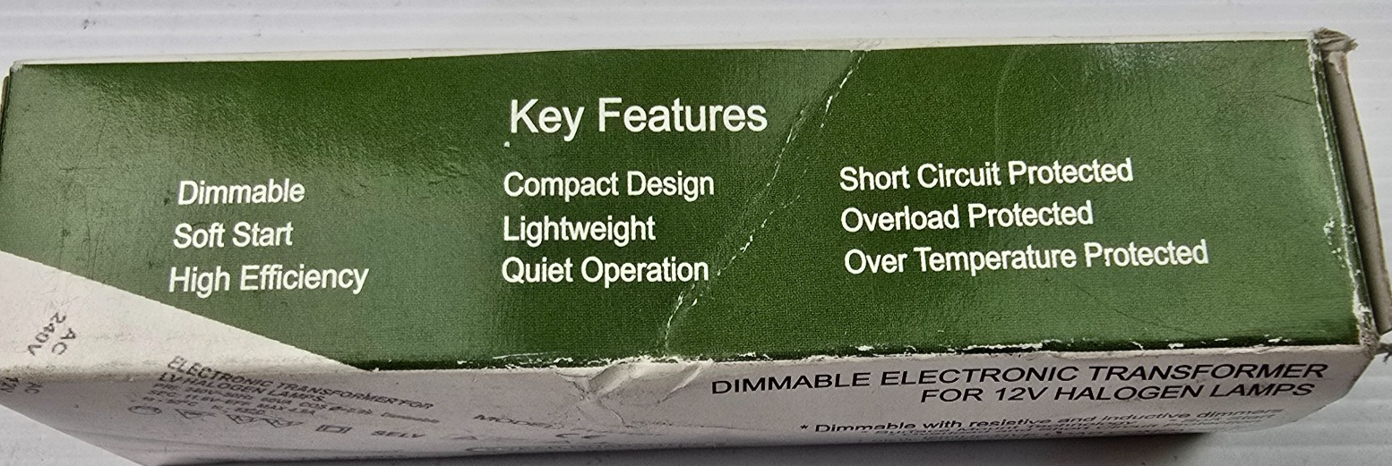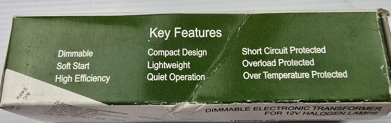 The National Lighting 71-ET60T is a high-quality electronic dimmable transformer designed for use with 12V halogen lighting systems. With a 60W power rating and advanced protection features, it ensures safe, reliable, and efficient operation for recessed and decorative lighting applications.