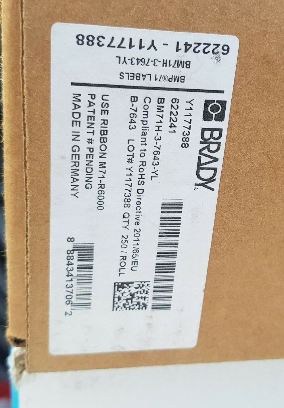 Brady 622241 BM71H-3-7643-YL 75x25 Yellow BMP71 Heatex Cable Marker Box 250