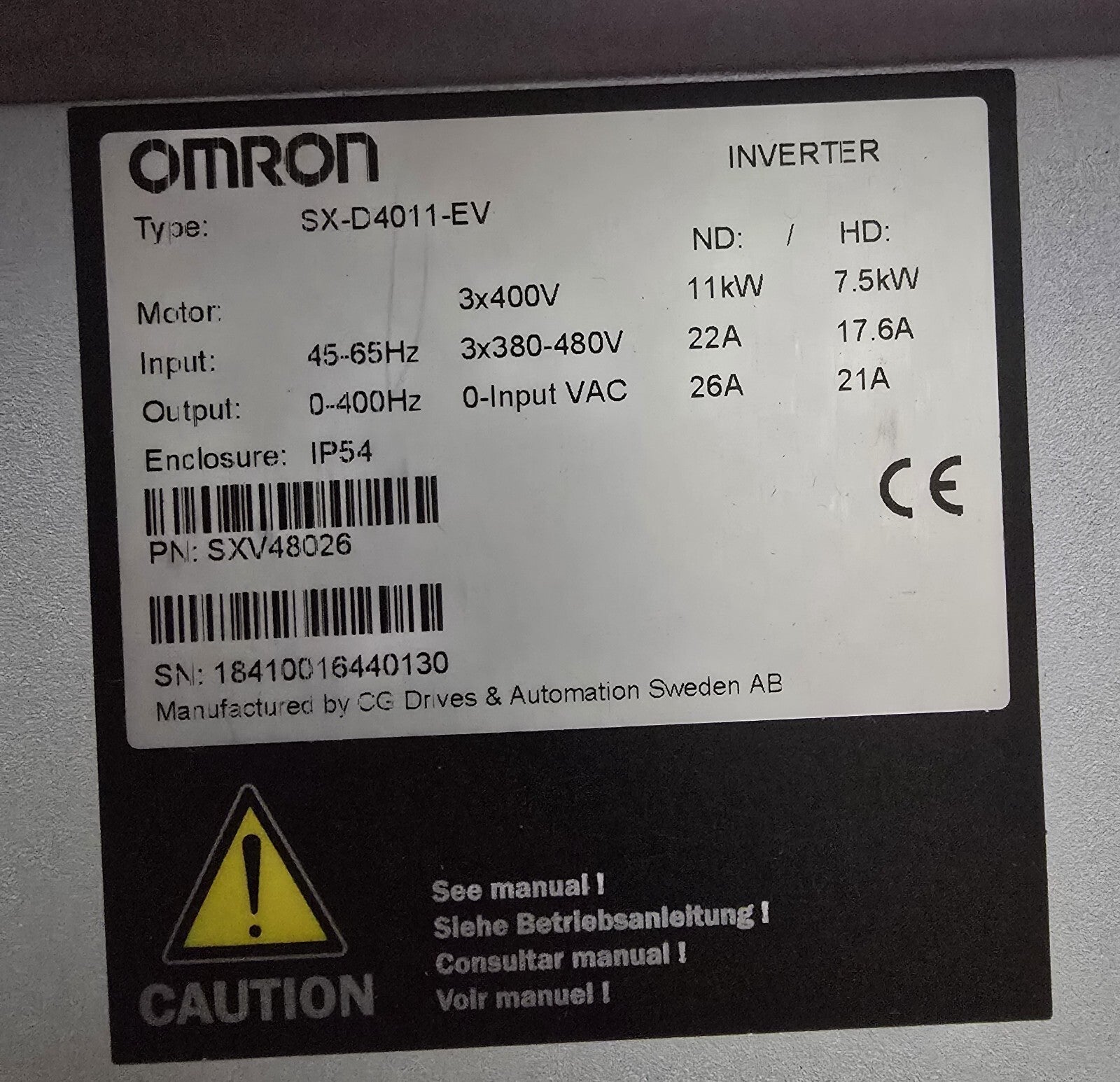 OMRON SX-D4011-EV VSD 11 kW 400 VAC 3P IP54 V/f Control With EMC Filter