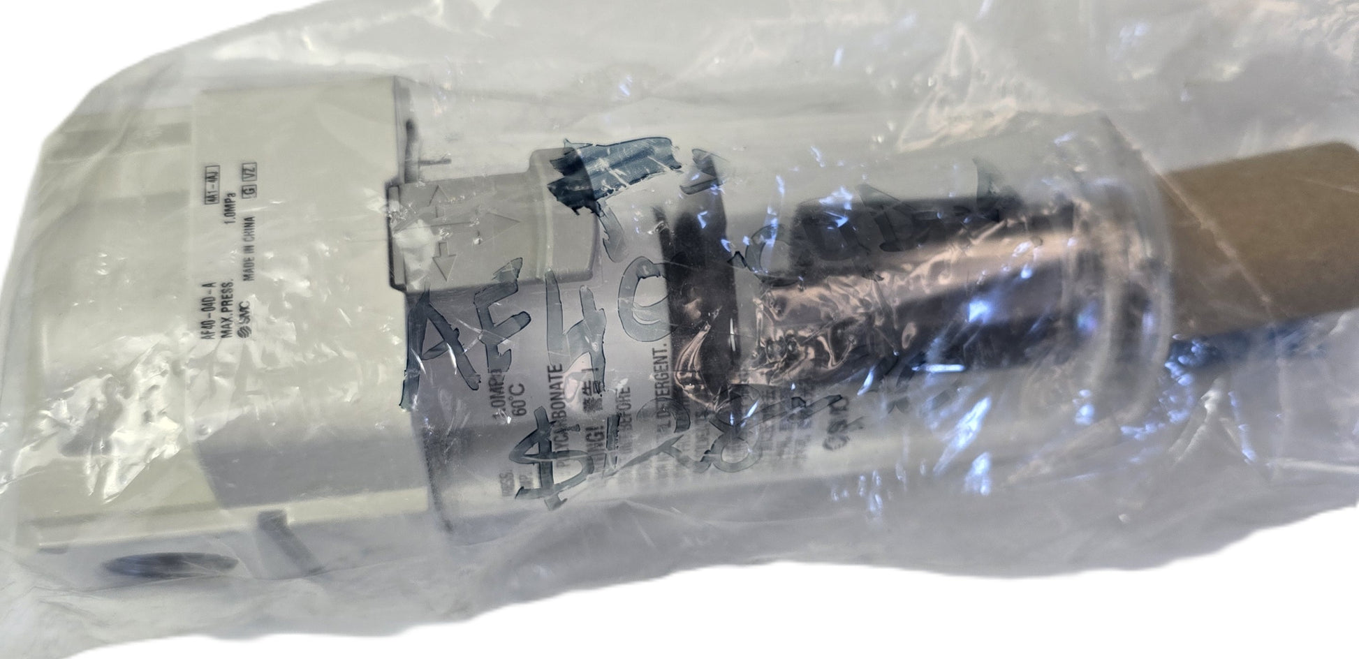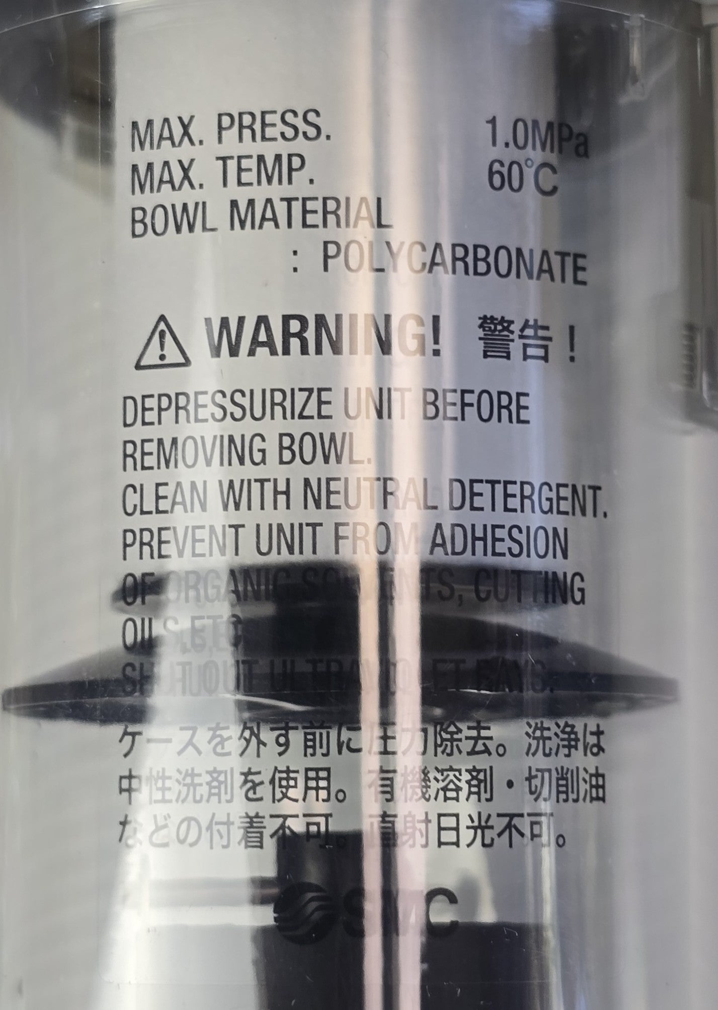 Description: Industrial air filter / mist separator with polycarbonate bowl. Max pressure 1.0MPa, max temp 60°C. Designed for removing moisture and particulates from compressed air lines.